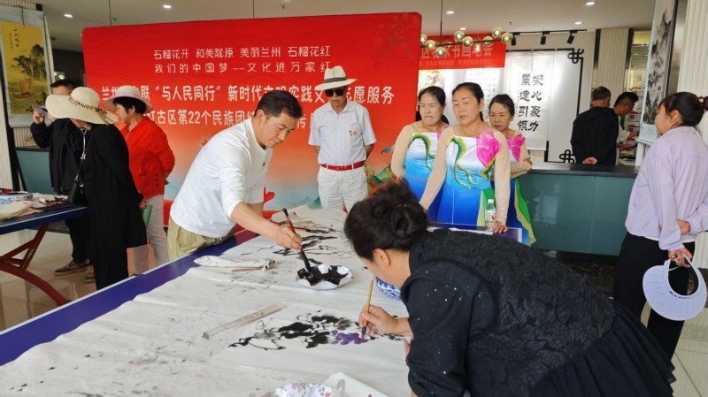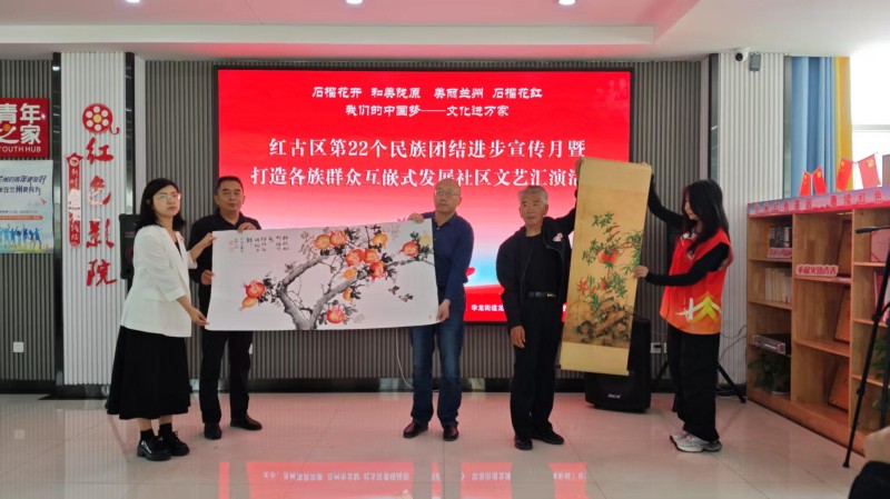 活动在开场舞《中华全家福》欢快的节奏中拉开序幕,刚柔并济的二胡表演融合传统文化精髓,赢得阵阵掌声;京剧表演《梨花颂》音律高远,宛如梨花飘舞,展现京剧独有的艺术魅力。笔会现场墨香四溢,氛围热烈,市文联的艺术家们凝神提笔、挥毫泼墨,把民族团结奋斗、繁荣发展、共建美好家园的故事融于笔下,创作出一幅幅主题鲜明、立意深远的优秀作品,共同唱响民族团结主旋律。活动现场,主办单位还向龙源社区赠送了30幅“红石榴”主题书画作品,市文联机关党支部和龙源社区的志愿者们还为现场群众发放《民法典小知识》、保密安全和移风易俗主题的各类宣传资料120余份。