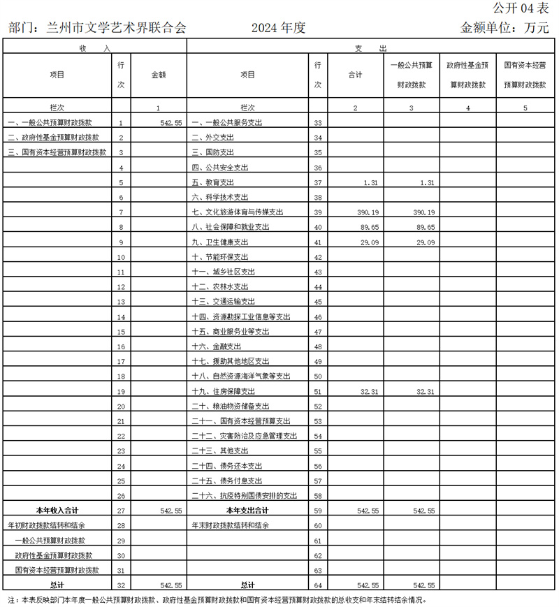 2024年度收、支总计均为542.55万元。与上年度相比,收、支总计各减少24.38万元,下降4.30%,主要原因是2023年度追加“山河故事——我和我的城市”庆祝二十大大型文艺综合展项目经费,2024年无此项目。