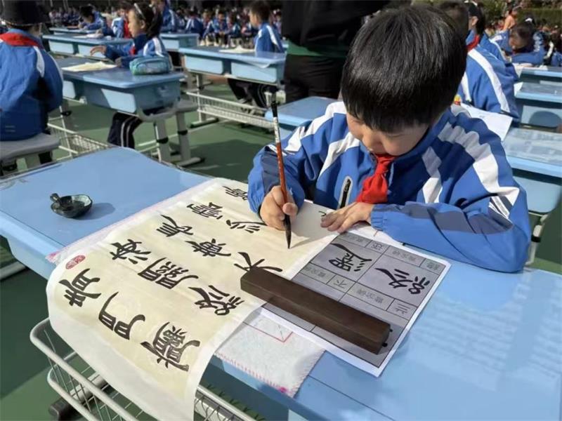 活动现场,百余名学生齐聚操场,挥毫泼墨,书写经典,尽显书法功底与艺术风采。书法家们亲临现场,对学生们的作品进行专业指导,从笔法、结构、章法等维度进行细致点评,让学生们对书法技艺的精髓有了更直观更深刻的认知。活动期间还对首届书法测评中的优秀学生予以奖励,进一步激发了学生们对书法艺术的热爱与热情。