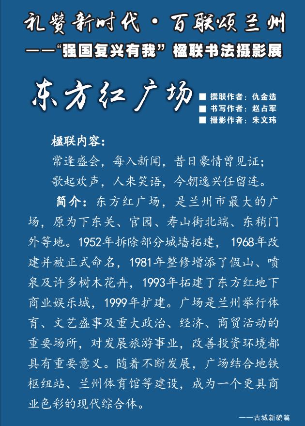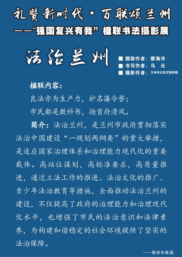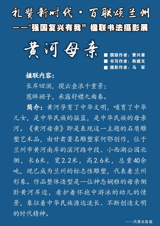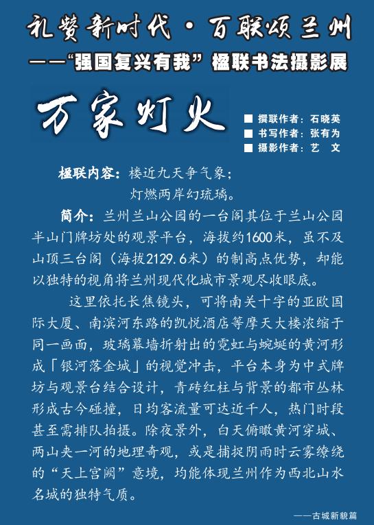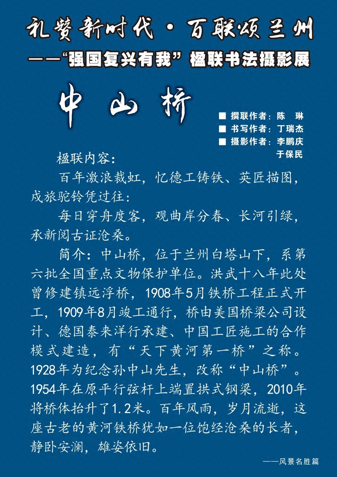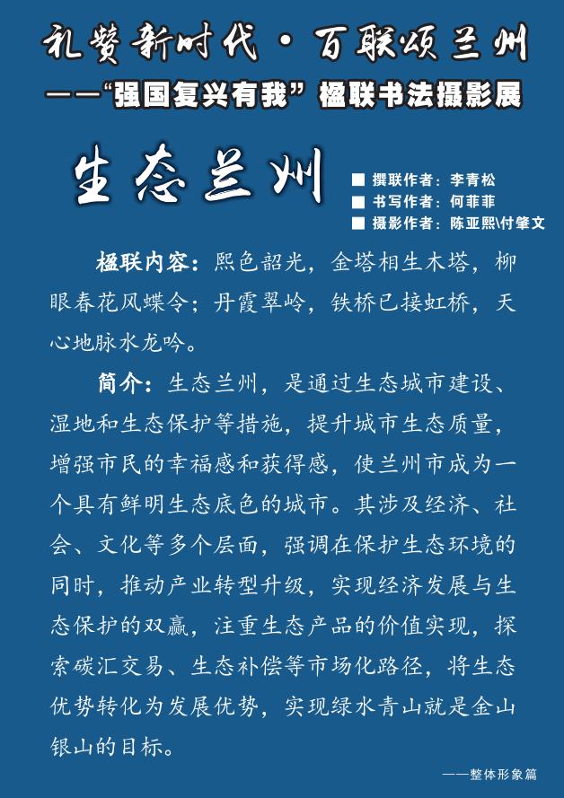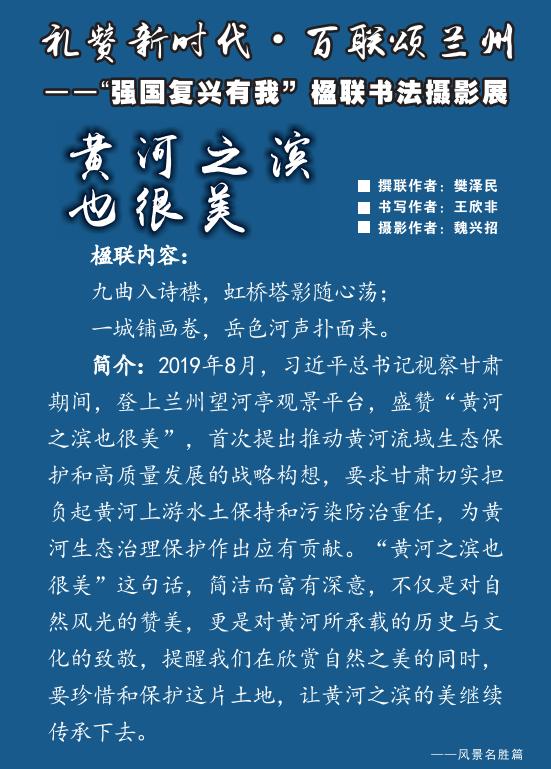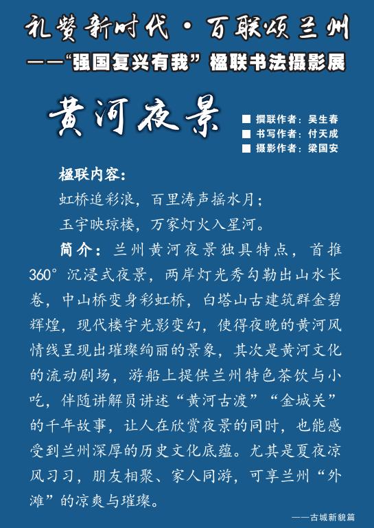 愿观者驻足于笔墨光影之间,从“丝路重镇”的雄浑里读懂历史,从“地铁穿黄河”的壮阔中感受当下,从“牛肉面”的乡愁里触摸温情,于百联百景中,品出兰州独有的厚重与鲜活,以楹联为桥、以书法为言、以光影为媒,颂一城风华,传一方文脉。