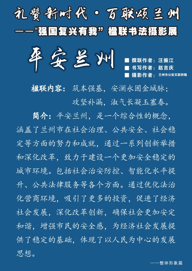 黄河九曲穿城而过,滋养出金城的厚重底蕴;丝路驼铃余音未散,镌刻下兰州的人文印记。为深入学习贯彻习近平文化思想,积极践行市委关于文化兰州建设的要求,“礼赞新时代·百联颂兰州”--“强国复兴有我”楹联书法摄影展携笔墨之韵、光影之趣而来,特邀甘肃省楹联学会楹联名家精心创作百副楹联,邀请省、市书法名家以此挥毫泼墨深情礼赞,摄影名家以此光影留痕鲜活定格。