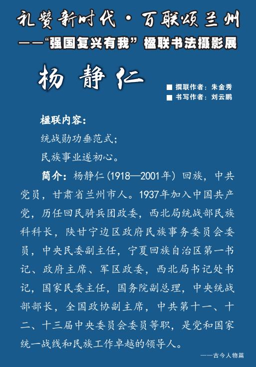 标题:杨静仁 撰联作者 朱金秀 书写作者 刘云鹏