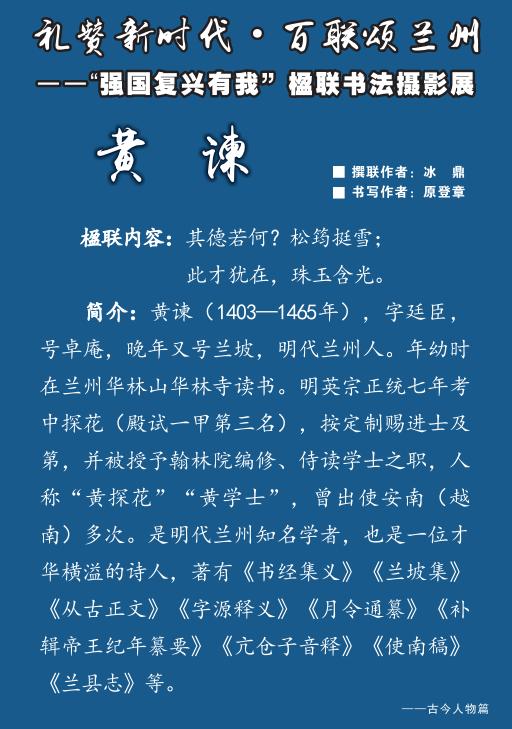 标题:黄谏 撰联作者 冰鼎 书写作者 原登章