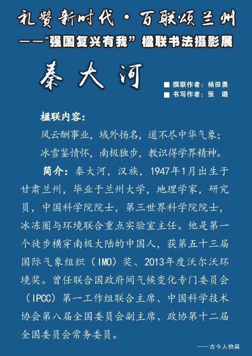 标题:秦大河 撰联作者 杨田勇 书写作者 张璐
