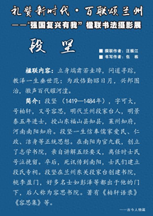 标题:段坚 撰联作者 汪振江 书写作者 包栋